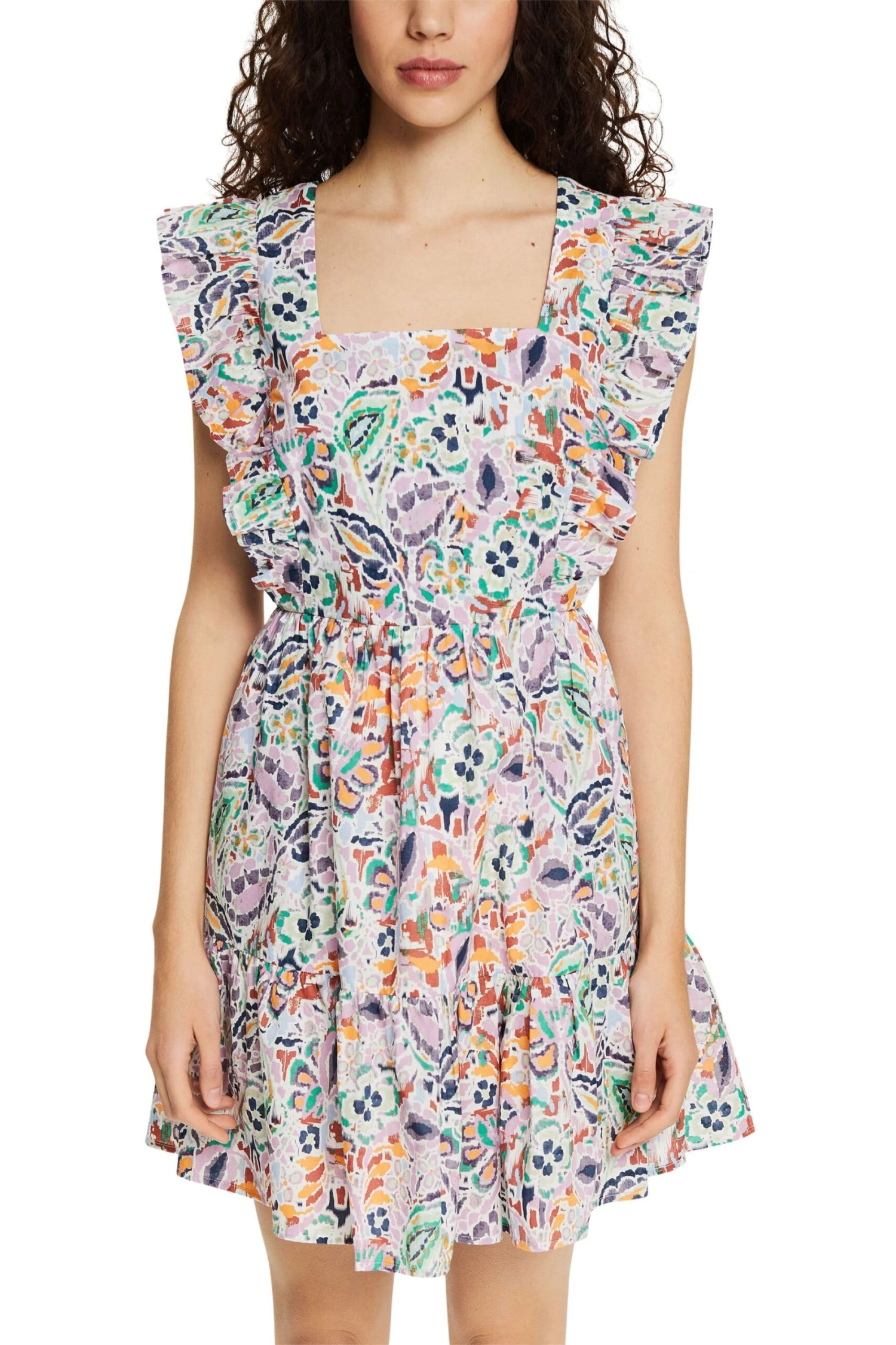 * Leichter Webstoff aus Baumwolle * Allover bunt gemustert * Karree-Ausschnitt * Gesmokter Einsatz am Rücken * Angesetzte Volantärmel * Seitliche Eingriffstaschen * Breiter Volantsaum * Ausgestellter Rock in Minilänge Pflegehinweise: 40°C Pflegeleicht, Nicht bleichen, Nicht im Wäschetrockner trocknen, Mäßig heiß bügeln, Nicht trockenreinigen