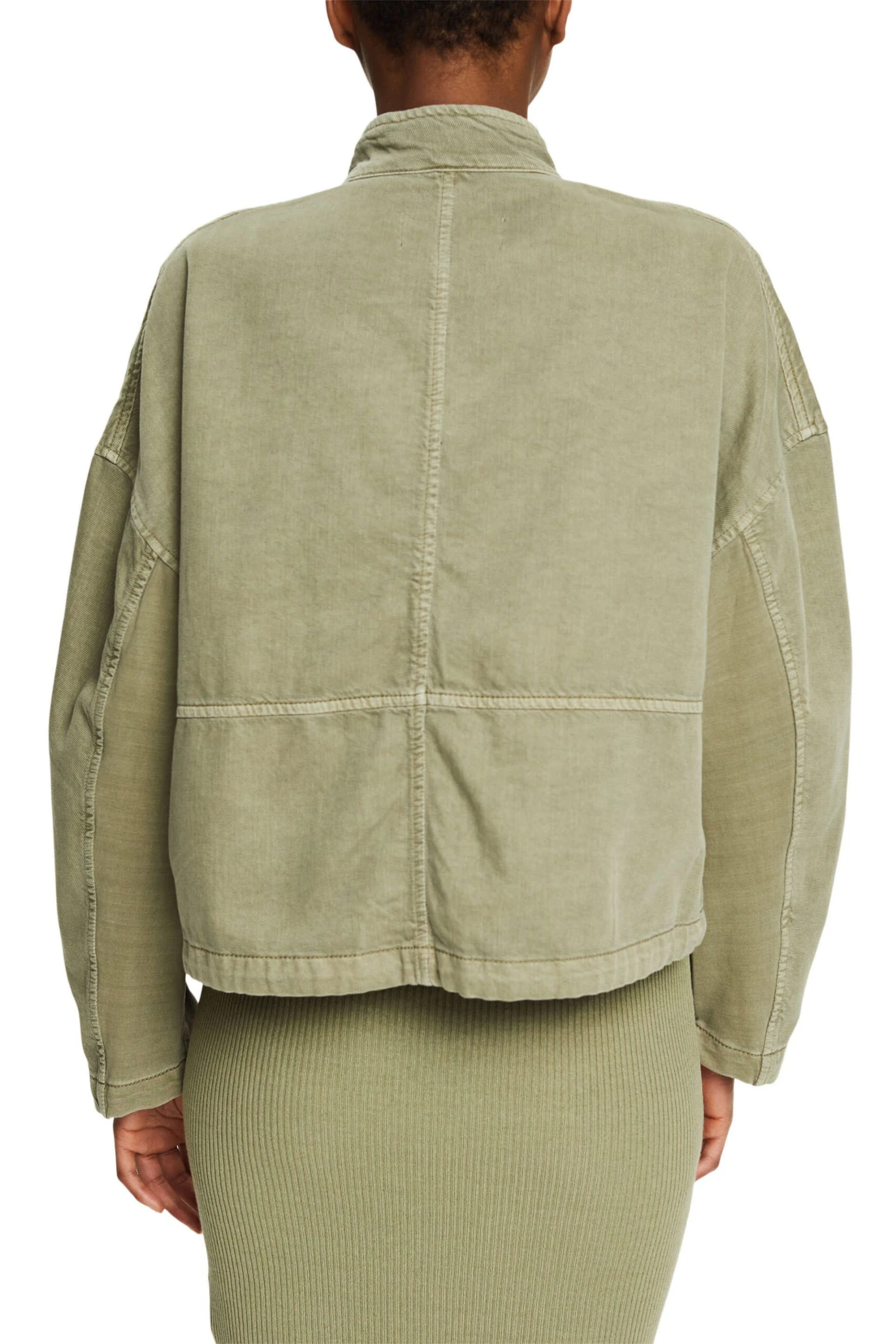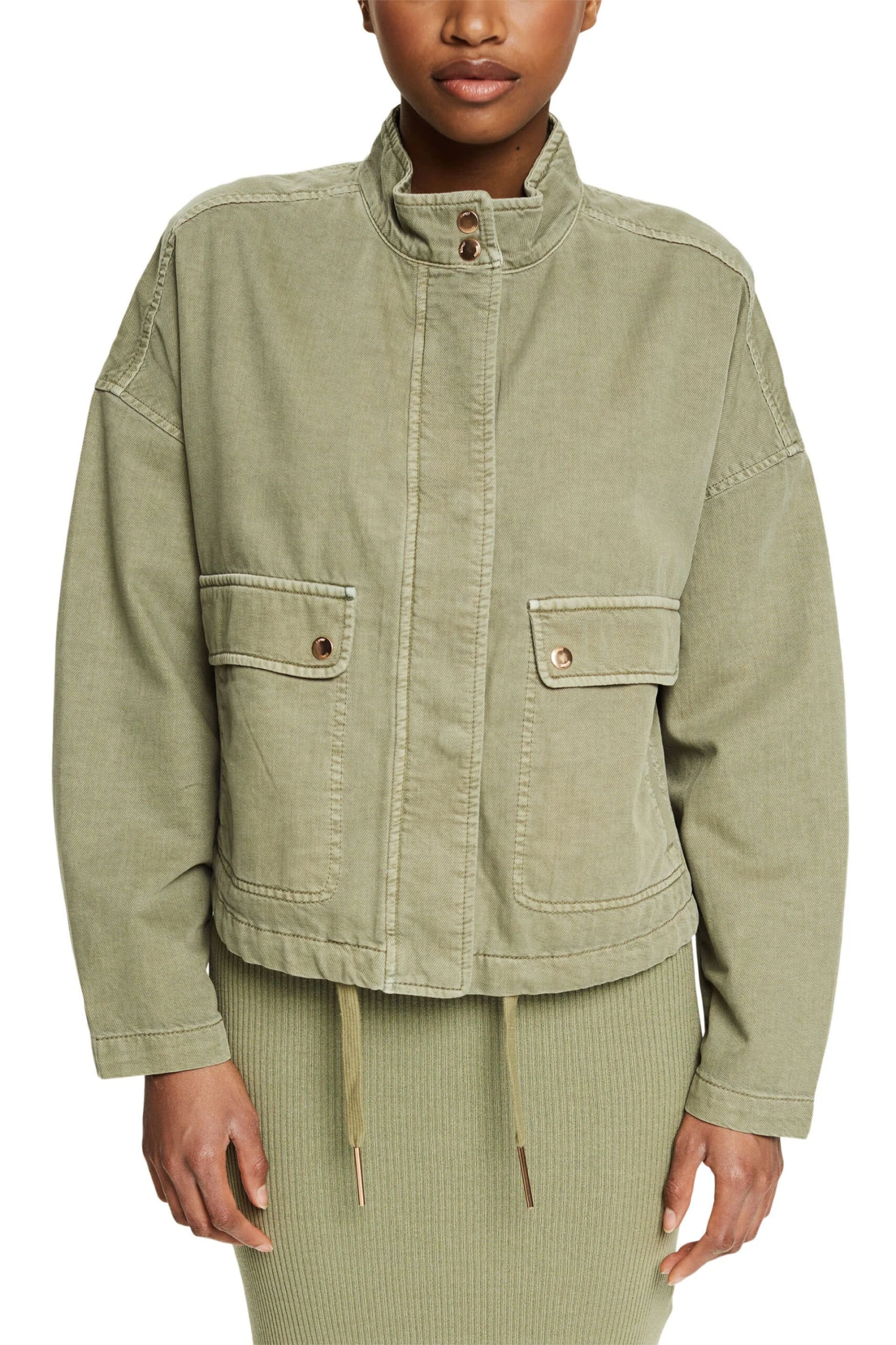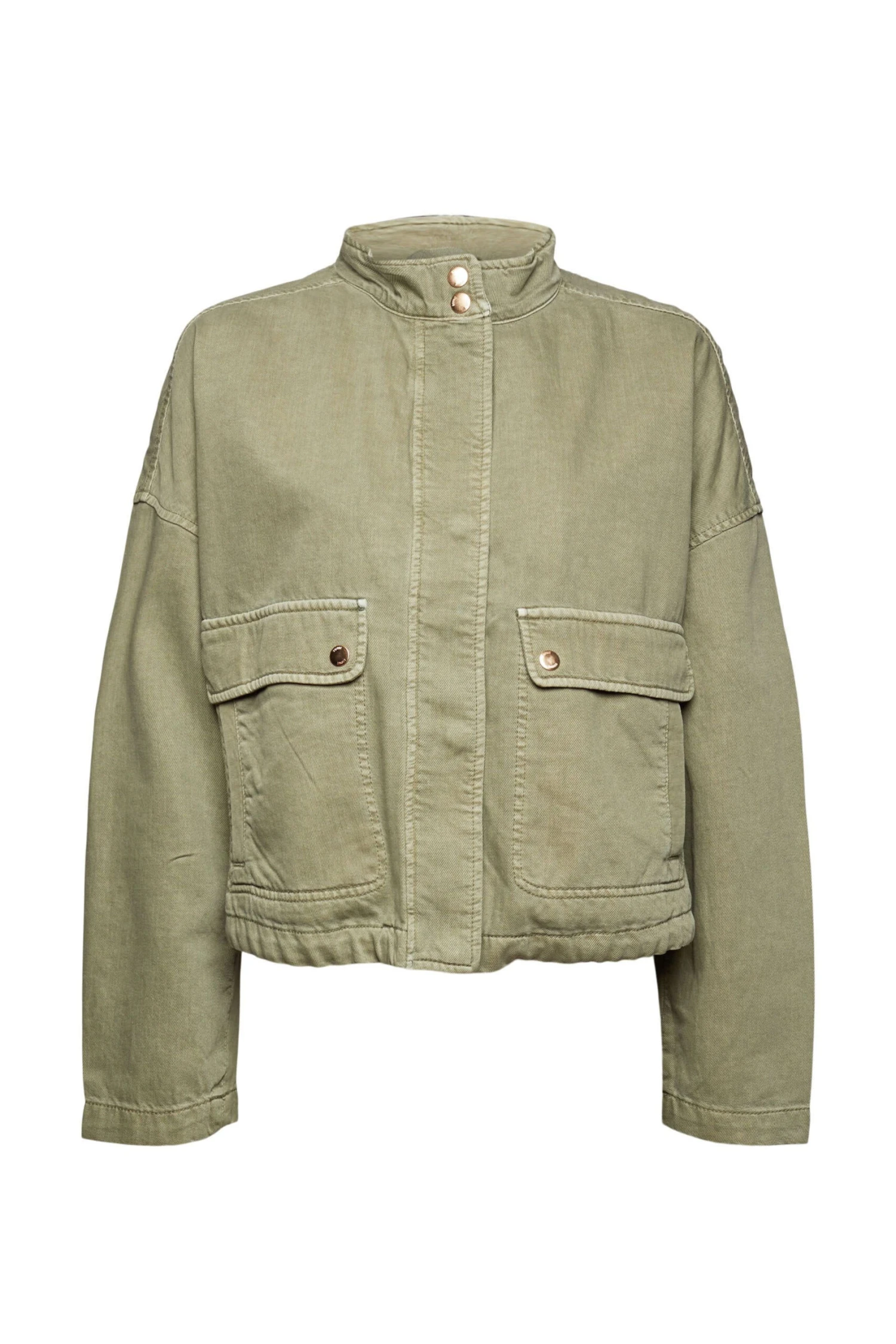 * Webstoff aus Baumwoll-Mix mit Lyocell * Hoch geschlossener Stehkragen mit Druckknöpfen * Mittiger, verdeckter Metallzipper * Überschnittene Schultern * Ärmellänge: ca. 74 cm (inkl. Schulterpartie) * Zwei dekorative aufgesetzte Pattentaschen mit seitlichen Einschubtaschen * Innenliegender Kordelzug am unteren Saum * Kastige, verkürzte Passform Pflegehinweise: 30°C Pflegeleicht, Nicht bleichen, Nicht im Wäschetrockner trocknen, Mäßig heiß bügeln, Nicht trockenreinigen